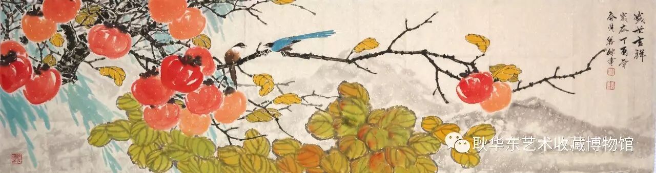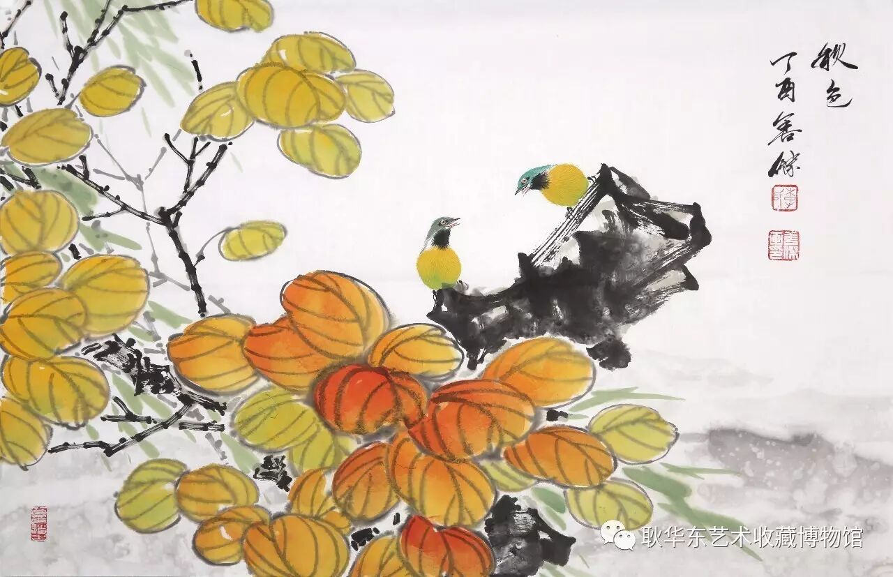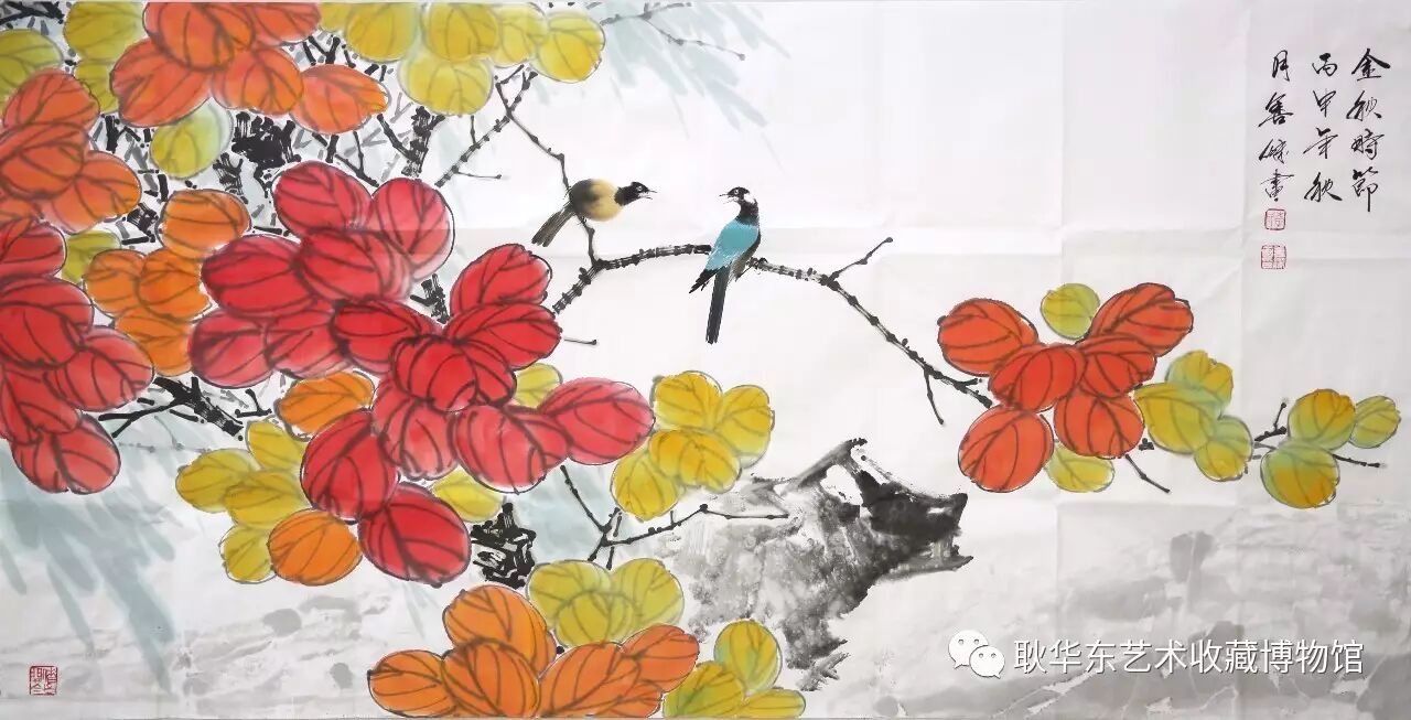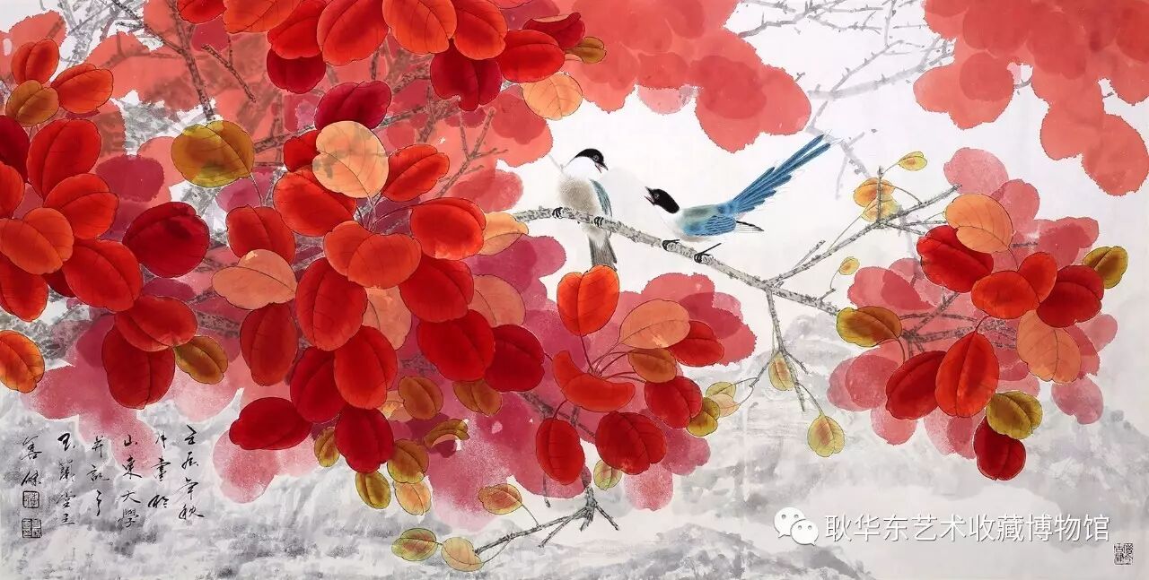 《红叶喜鹊》 规格:68cmx136cm 录入博物馆画册第一刊 出展于耿华东艺术收藏博物馆