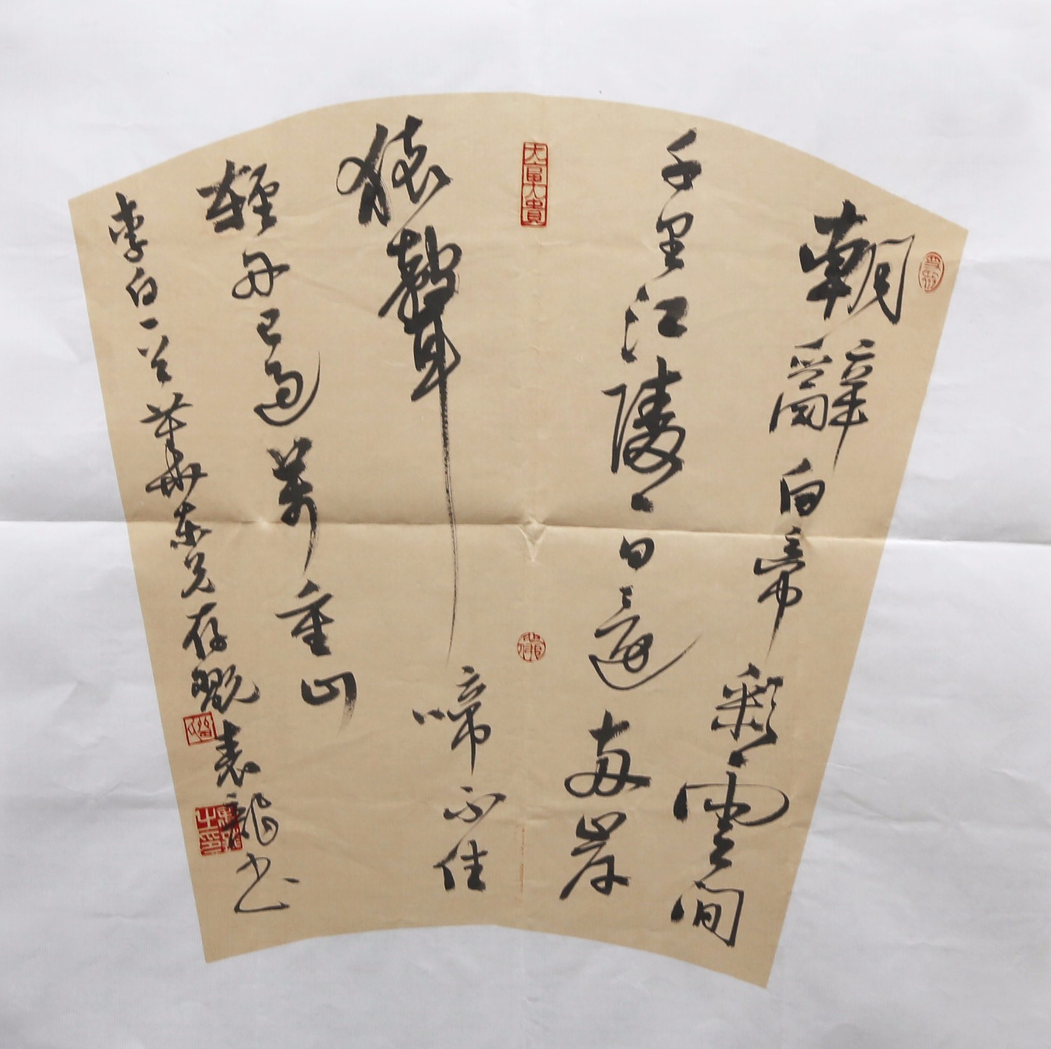 刘表龙扇面《唐.李白-早发白帝城》50-50(朝辞白帝彩云间,千里江陵一日还。两岸猿声啼不住,轻舟已过万重山。) ; 尺寸: 68.0 x 68.0 cm ; 价格: /平尺