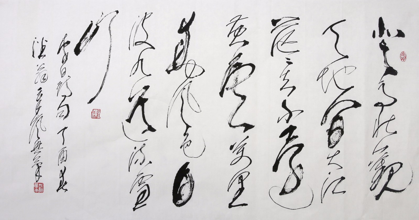 潘章岚《唐.李白的-庐山谣寄卢侍御虚舟》136-68(登高壮观天地间,大江茫茫去不还。黄云万里动风色,白波九道流雪山。好为庐山谣,兴因庐山发。) ; 尺寸: 68.0 x 136.0 cm ; 价格: /平尺